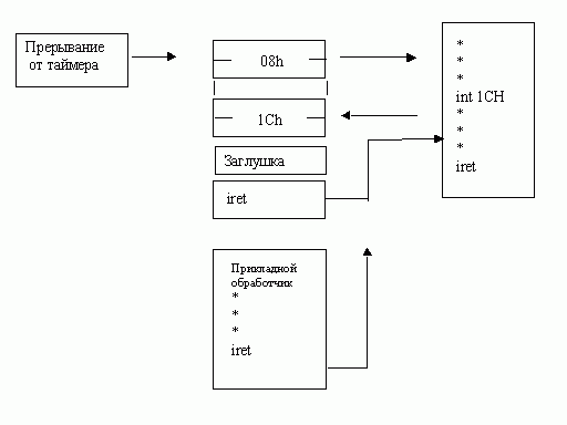Для того чтобы прикладные программы могли использовать сигналы таймера, не нарушая при этом работу системных часов, в программу BIOS, обслуживающую аппаратные прерывания от таймера, поступающие через вектор 08, включен вызов int 1Ch, передающий управление на программу-заглушку BIOS, которая содержит единственную команду iret (рис. 46.1.). пользователь может записать в вектор 1Ch адрес прикладного обработчика сигналов таймера и использовать в своей программе средства реального времени. Естественно, перед завершением программы следует восстановить старое значение вектора 1Ch.